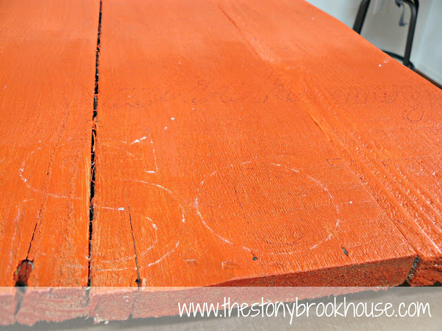 I tried to use the technique I used on my damask stencil post, but that didn’t work very well. The wood wasn’t as soft and with the semi gloss paint it didn’t want to indent too well. Ok, plan B, I tried a fine tipped sharpie to trace the letters and let it bleed through the paper as I traced. Perfect!