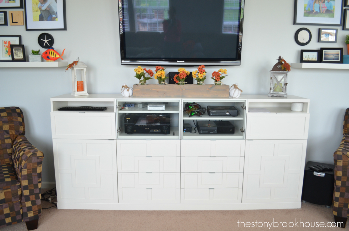 I think some cute little blocks or little pumpkins that say "gather" or "blessings" would look cute in front of the TV box. I don't know what else to call it but the TV box.